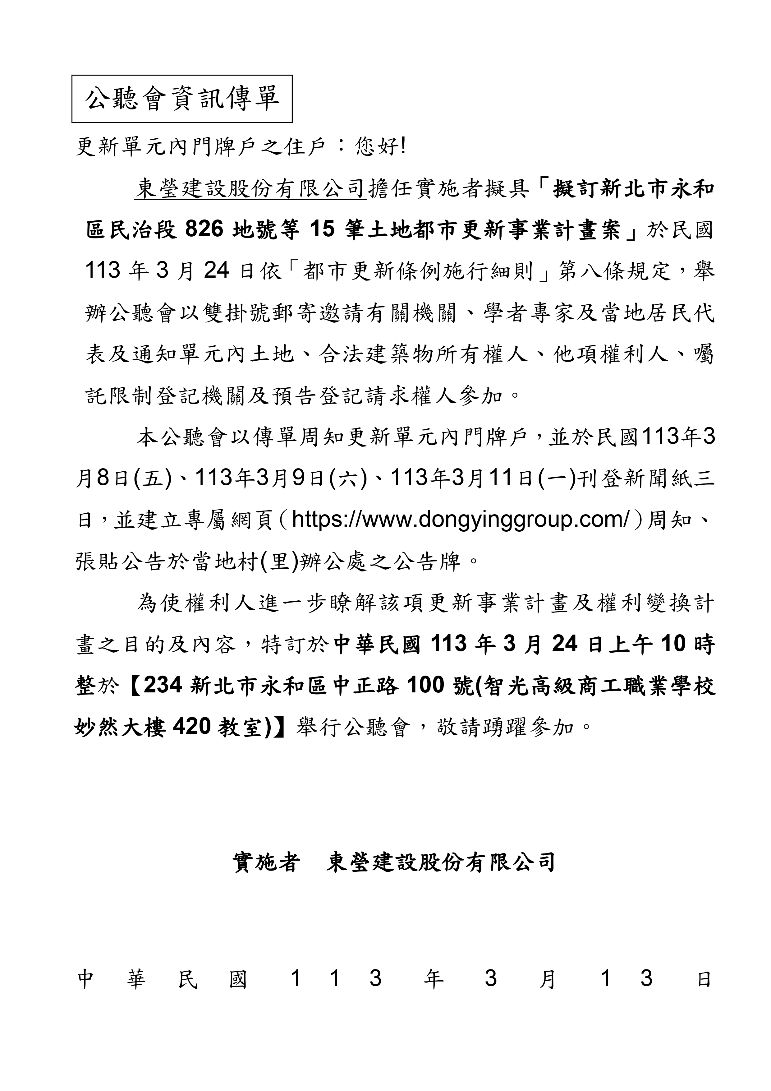 新北市永和區民治段826地號等15筆土地都市更新案